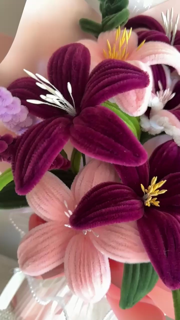 Fall in love with the timeless beauty of our Blush Romance Bouquet, a stunning handmade flower arrangement crafted from high-quality pipe cleaners. Designed in soft blush pinks with rich burgundy tones and finished with elegant greenery, this bouquet brings romance and charm to any occasion.